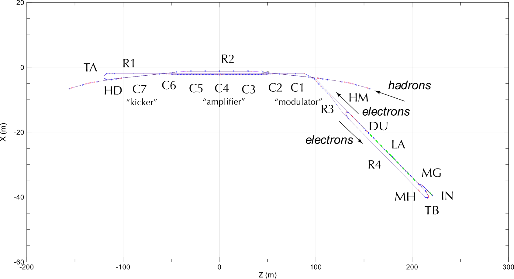 In this project, Xelera Research LLC, in collaboration with BNL and JLab scientists, designed and studied an energy-recovery linac (ERL) system capable of cooling EIC hadrons. A complete, closed optics design from cathode to beam stop was created for the high energy operation mode of the ERL (cooling 275 GeV protons). The design comprises a complete beamline, including the injector, merger, main linac, cooling section, return line, and beam stop. The layout geometry is shown here with section labels: Injector (IN), Merger (MG), ERL Linac (LA), Hadron Merge (HM), Cooling sections (C1 – C7), Hadron Demerge (HD), Turnaround A (TA), Return line (R1 – R4), Turnaround B (TB), Merge High Energy (MH), and Dump (DU):