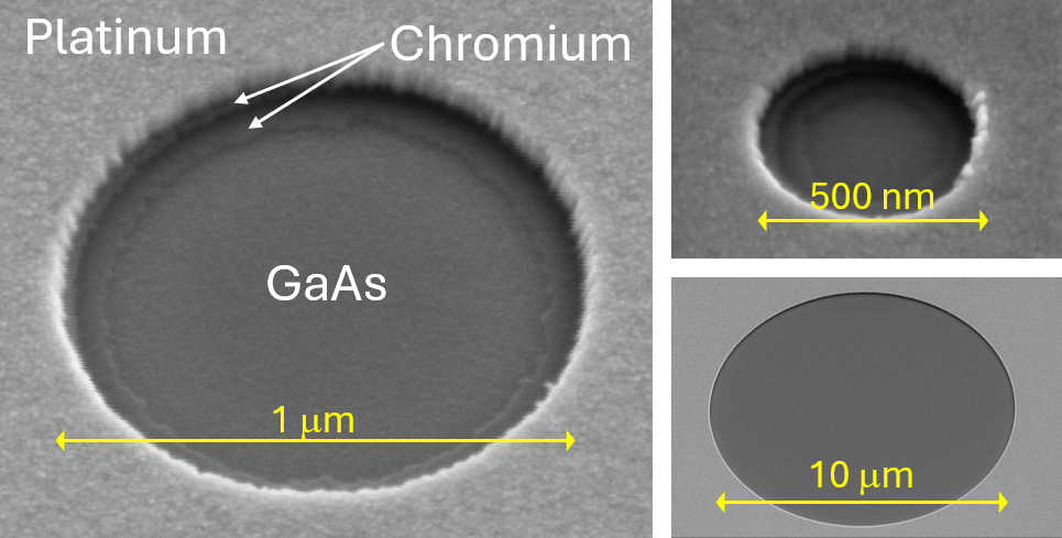 The platinum layer is then lithographically patterned and etched to create micro- and nano-scale holes, exposing the GaAs underneath.